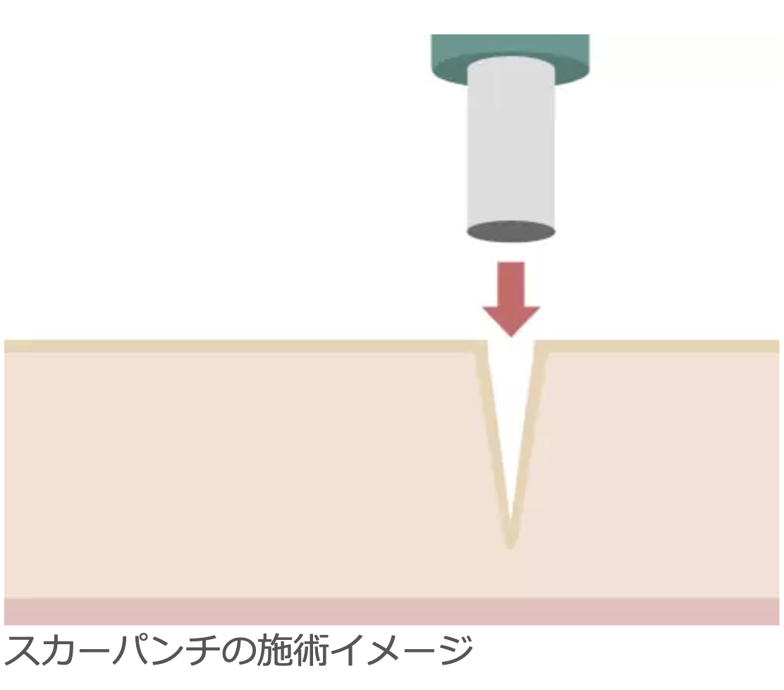 スカーパンチ(ニキビ跡のくり抜き手術)とは、注射による麻酔をした後にパンチという丸く穴を開ける道具でニキビ跡を丸くくり抜く方法です。