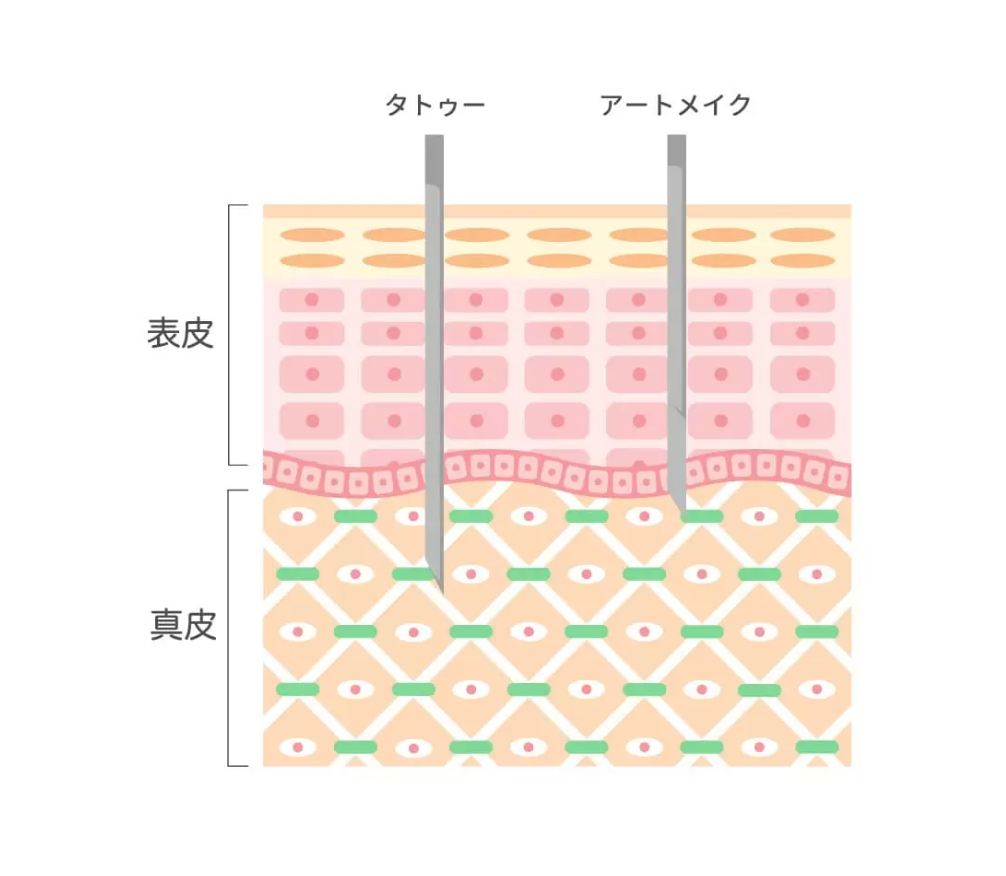 タトゥーは皮膚の真皮にまで針を入れる一方で、アートメイクは真皮の浅い部分(真皮乳頭部)にピグメント(色素)を入れていきます。