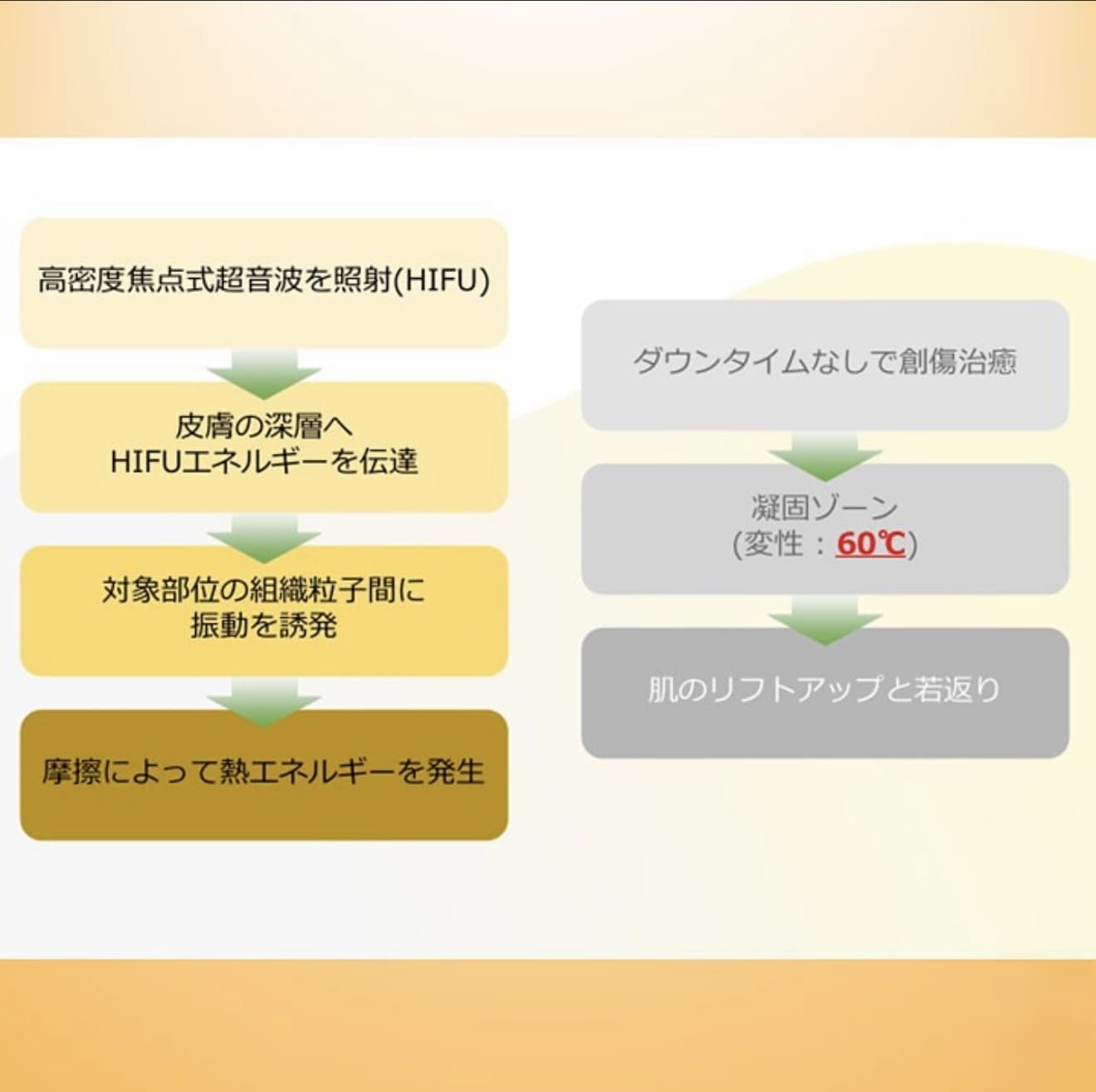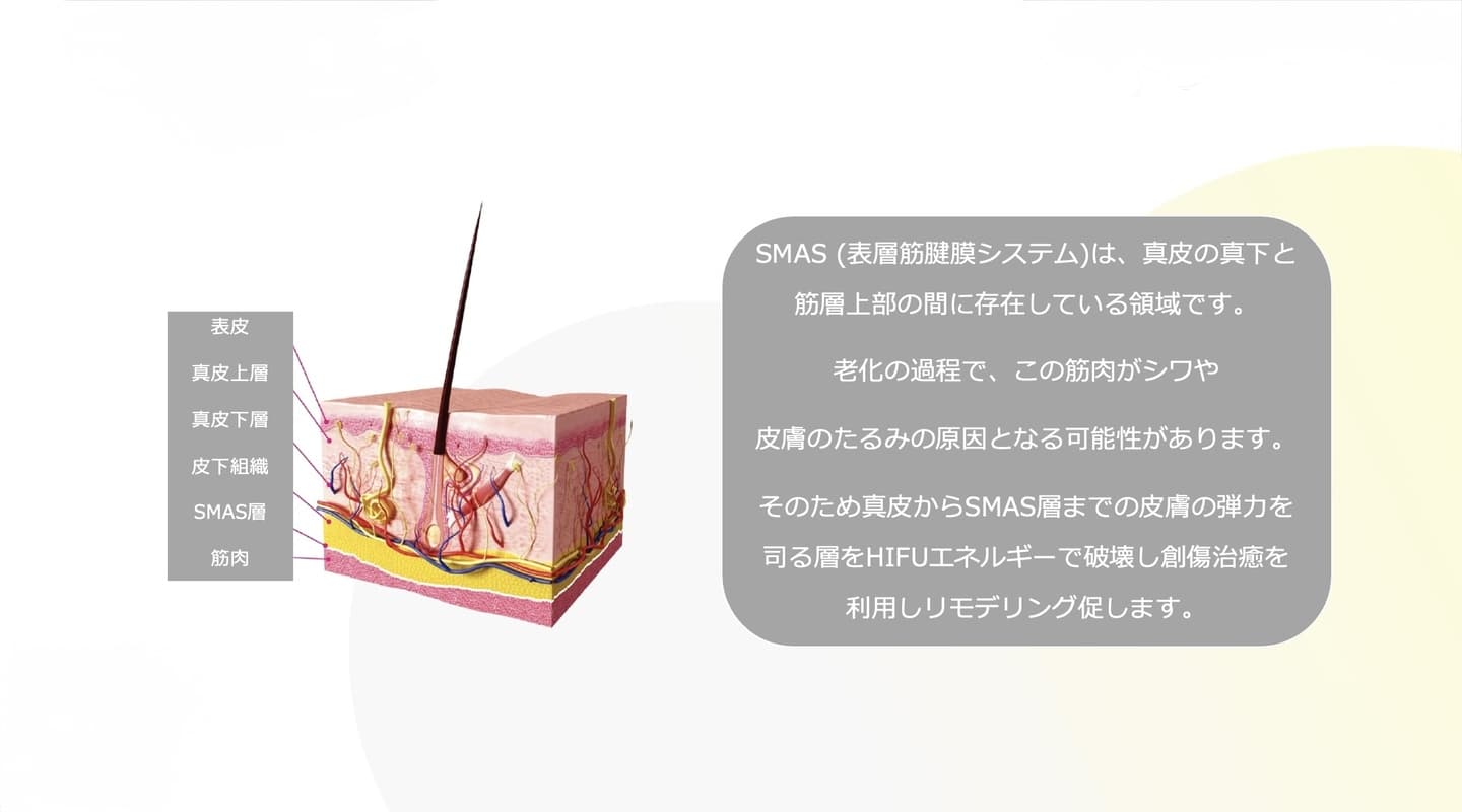 超音波による加熱作用でSMAS筋膜が縮むため、たるんだSMAS筋膜や皮下組織を引き締めます。皮膚のデリケートな目の周りの小じわの改善から顔全体のハリ感アップも期待できます。