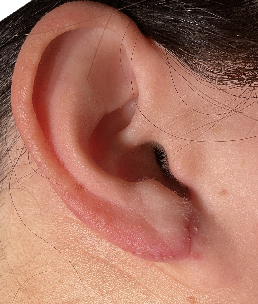 耳垂裂が複数ある場合、ケロイドが合併している場合は完全に耳の形を正常化できず変形が残る場合があります。 |