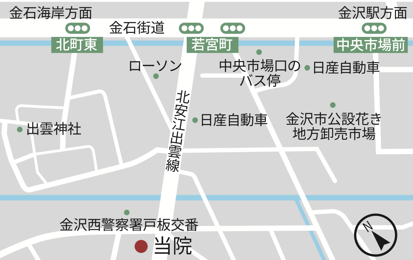 金石線〜畝田住宅線〜三馬大野線〜示野線(済生会経由)に乗車、中央市場口で下車して8号線側へ向かい、左手に日産やローソンがありますので若宮町の交差点左折し徒歩10分ほどで到着します。