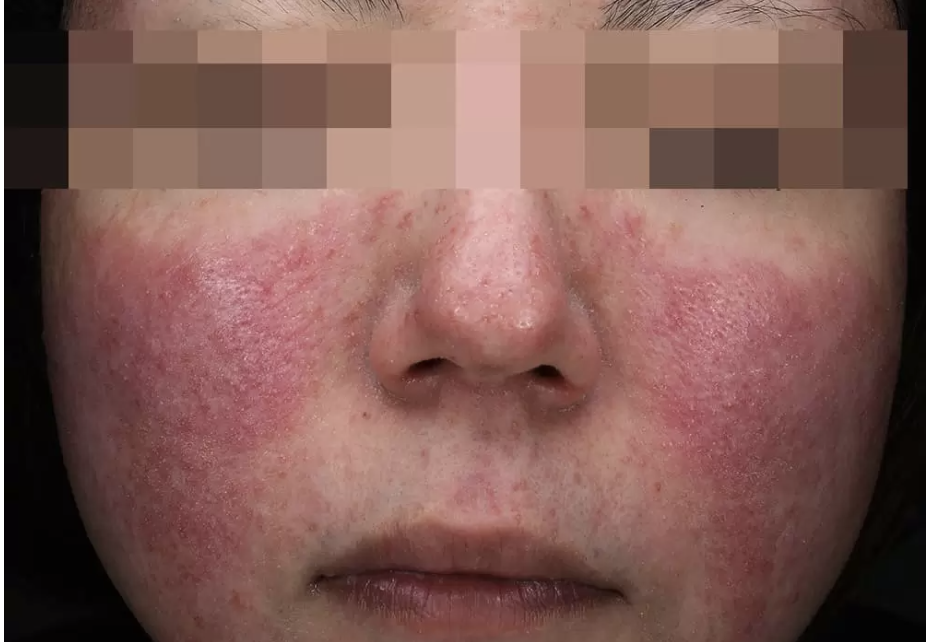 顔が時間によってはかなり赤くなり、毛細血管拡張症が見られます。ほてりやヒリヒリ感が伴います。更年期障害のフラッシングと鑑別が難しいことも多いです。