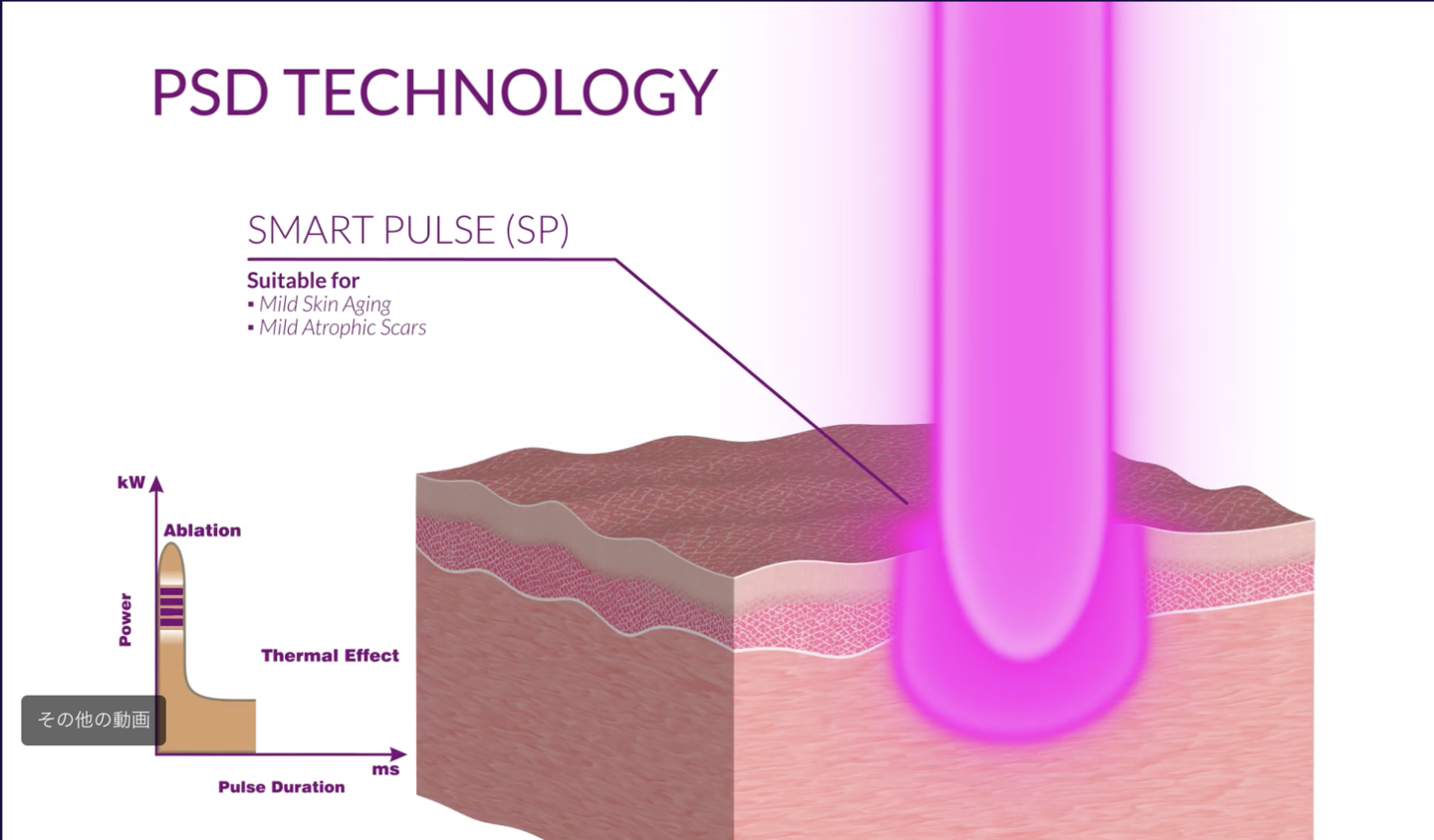 このレーザーの原理は、無数の細かい孔を皮膚に開け、ニキビ跡の凸凹、傷跡、小じわ、毛穴を縮めて治すというものです。CO2(炭酸ガス)フラクショナルレーザーであるSmartXide Puntoは、従来のCO2フラクショナルレーザーとは違い2つのパスル波形を組み合わせる(スマートパルス)ことにより、より深い位置で皮膚に熱ダメージを加えることが出来ます。スマートパルスを採用したことにより、出血・痛みが少ないにも関わらず、しっかりとした効果が出せるのがSmartXide Puntoです。