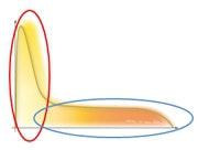 ローピークパルス(青の楕円)だけの波形では皮膚に対して熱ダメージを与えることは出来ますが、皮膚に穴を開ける能力に乏しく、発生した熱のほとんどは皮膚表面にとどまります。その為、痛みが強く、ヤケドのリスクも高くなります。